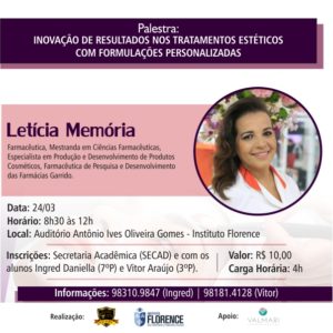 24 de março evento voltado ao ramo da farmácia estética, com a ilustre presença da Dra. Letícia Memória, que abordará o tema “