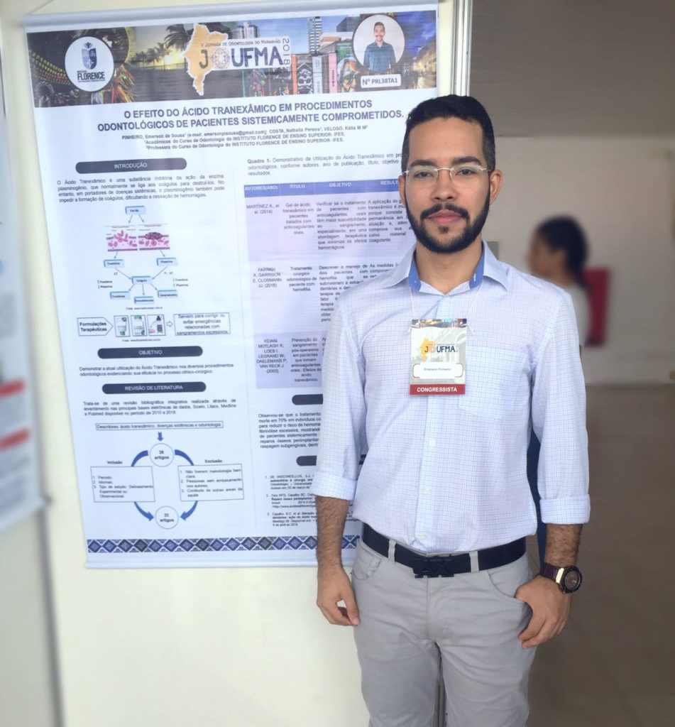Com o trabalho intitulado “O EFEITO DO ÁCIDO TRANEXÂMICO EM PROCEDIMENTOS ODONTOLÓGICOS DE PACIENTES SISTEMICAMENTE COMPROMETIDOS”, os acadêmicos do 5º período do Curso de Odontologia do Instituto Florence de Ensino Superior, Emerson de Sousa Pinheiro e Nathalia Pereira Costa obtiveram a premiação de 2º LUGAR NA CATEGORIA POSTER- REVISÃO DE LITERATURA na V JORNADA DE ODONTOLOGIA DO MARANHÃO, uma promoção do Curso de Odontologia da Universidade Federal do Maranhão, ocorrida no período de 21 a 23 de Junho de 2018, no Campus do Bacanga.
