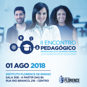 O Instituto Florence de Ensino Superior, por meio da Coordenação de Apoio Pedagógico aos Docentes e Discentes – CAP, em parceria com a direção acadêmica e coordenações de cursos, promoverá seu segundo Encontro Pedagógico do ano letivo de 2018.2. E para dar as boas-vindas ao corpo docente e iniciar as ações para o semestre letivo de 2018.2, traz o tema: “METODOLOGIA ATIVA NO ENSINO SUPERIOR: um caso de sucesso na vivência das estratégias de ensino Taxonomia de Bloom, TBL e Arco de Maguerez”. Tendo como objetivo compreender as estratégias de ensino Taxonomia de Bloom, TBL e Arco de Maguerez, identificando-as como metodologias de trabalho para serem vivenciadas em 2018.2, com foco na aprendizagem significativa do aluno Florence.“.