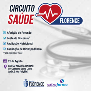 O Circuito Saúde, projeto do Instituto Florence de Ensino em  parceria com a Rede de Farmácias Extrafarma, realizará mais um dia de atendimentos da  equipe dos seus Cursos de Saúde,  no dia 23 de agosto (sexta-feira), na Extrafarma do Cohatrac ( Avenida do Contorno Oeste)