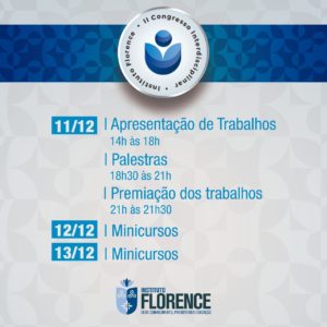 Comissão Organizadora do II Congresso Interdisciplinar do Instituto Florence de Ensino Superior comunica, que as atividades acadêmicas que ficaram pendentes, terão continuidade nos dias 11, 12 e 13 de dezembro, no auditório do Instituto Florence.