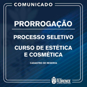 A Diretoria Acadêmica do Instituto Florence Ensino Superior comunica aos interessados que serão prorrogadas até o dia 10 de janeiro, as inscrições para o Processo Seletivo Docente Simplificado, para cadastro de reservas do EDITAL Nº 04/2019, para o Curso de Estética e Cosmética
