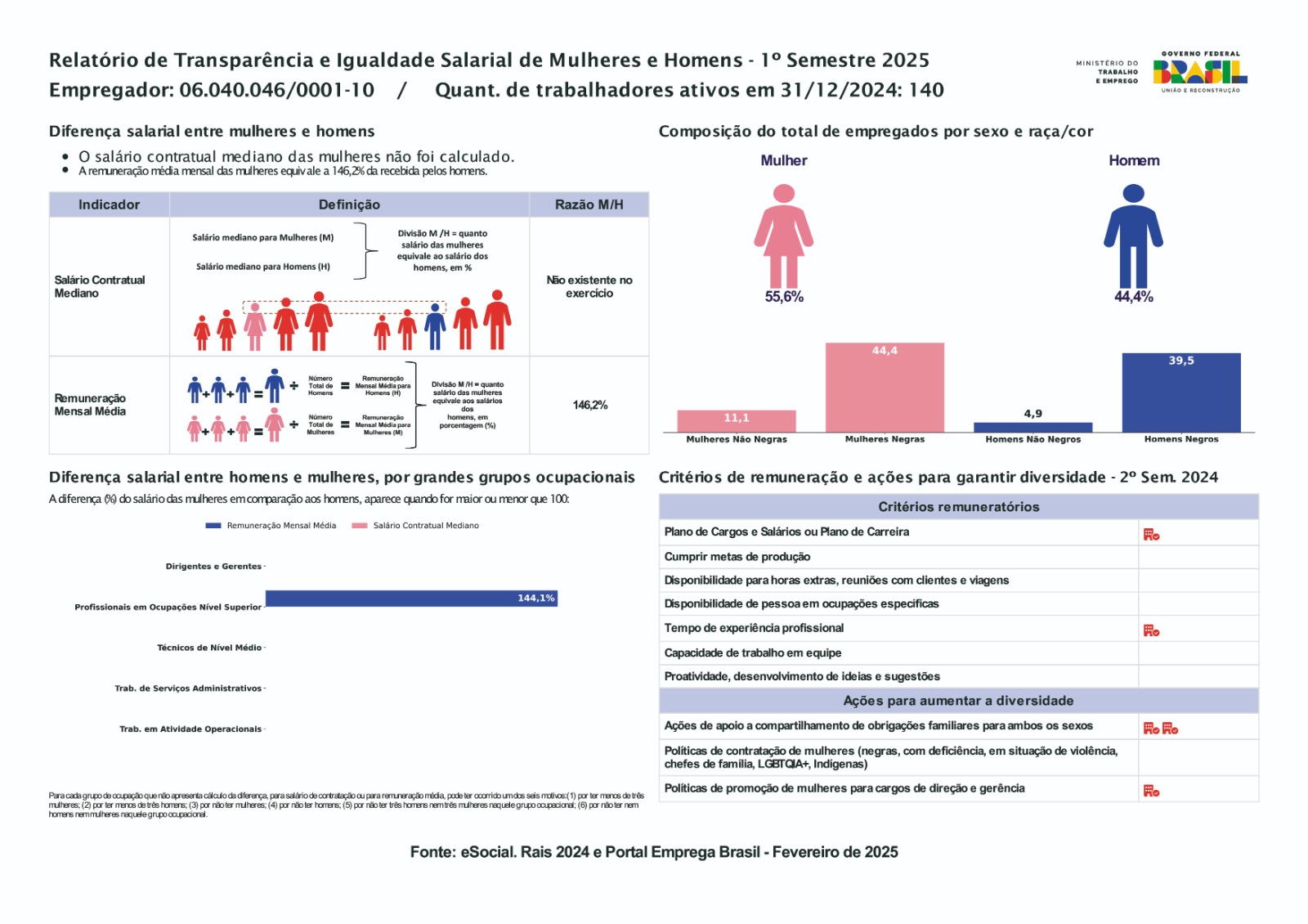 No primeiro semestre de 2025, a instituição contava com 140 trabalhadores ativos em 31 de dezembro de 2024. O salário contratual mediano das mulheres não foi calculado, enquanto a remuneração média mensal das mulheres correspondia a 146,2% da média recebida pelos homens. A composição do quadro de colaboradores era de 55,6% mulheres e 44,4% homens. O relatório também detalha a diferença salarial entre homens e mulheres por grandes grupos ocupacionais, observando que, quando não há cálculo disponível, isso pode ocorrer devido à quantidade insuficiente de colaboradores em determinado grupo, ausência de mulheres ou homens, ou outras contingências relacionadas ao número de funcionários.