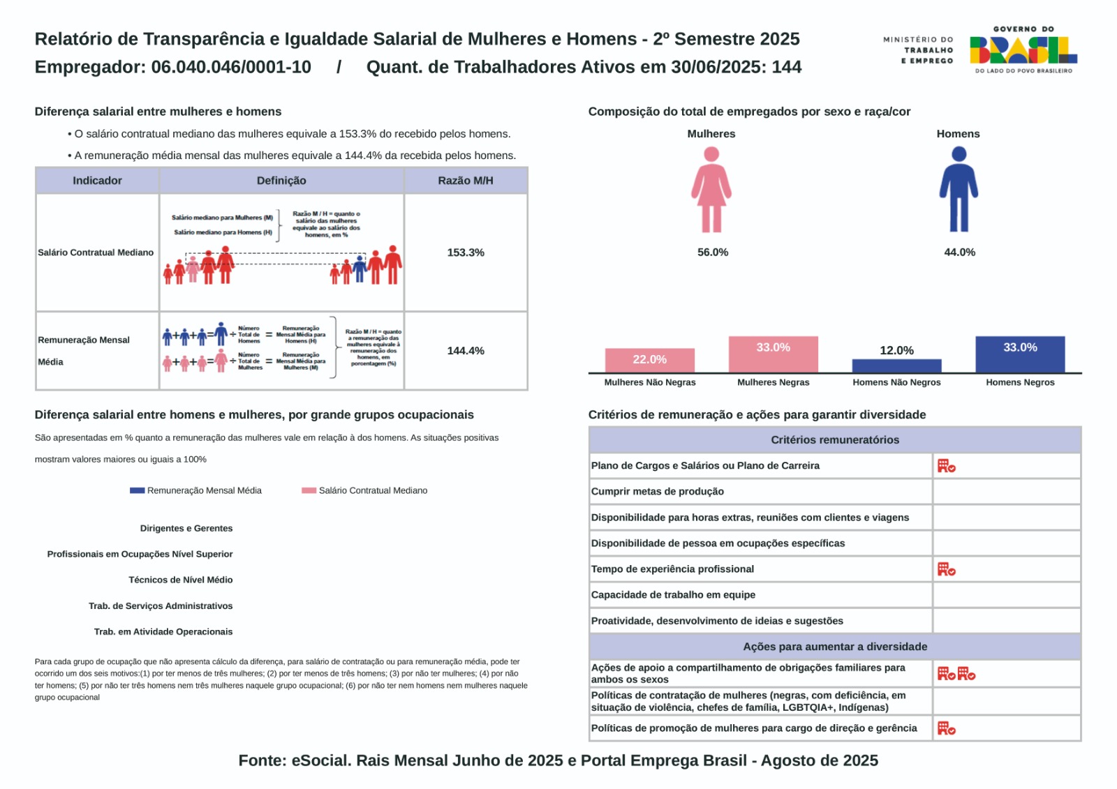O relatório detalha a diferença salarial entre homens e mulheres por grandes grupos ocupacionais, incluindo dirigentes e gerentes, profissionais em ocupações de nível superior, técnicos de nível médio, trabalhadores de serviços administrativos e trabalhadores em atividades operacionais. Para cada grupo em que não é apresentado cálculo da diferença salarial, os motivos podem incluir menos de três mulheres, menos de três homens, ausência total de mulheres ou homens, ou insuficiência de colaboradores para realizar o cálculo.